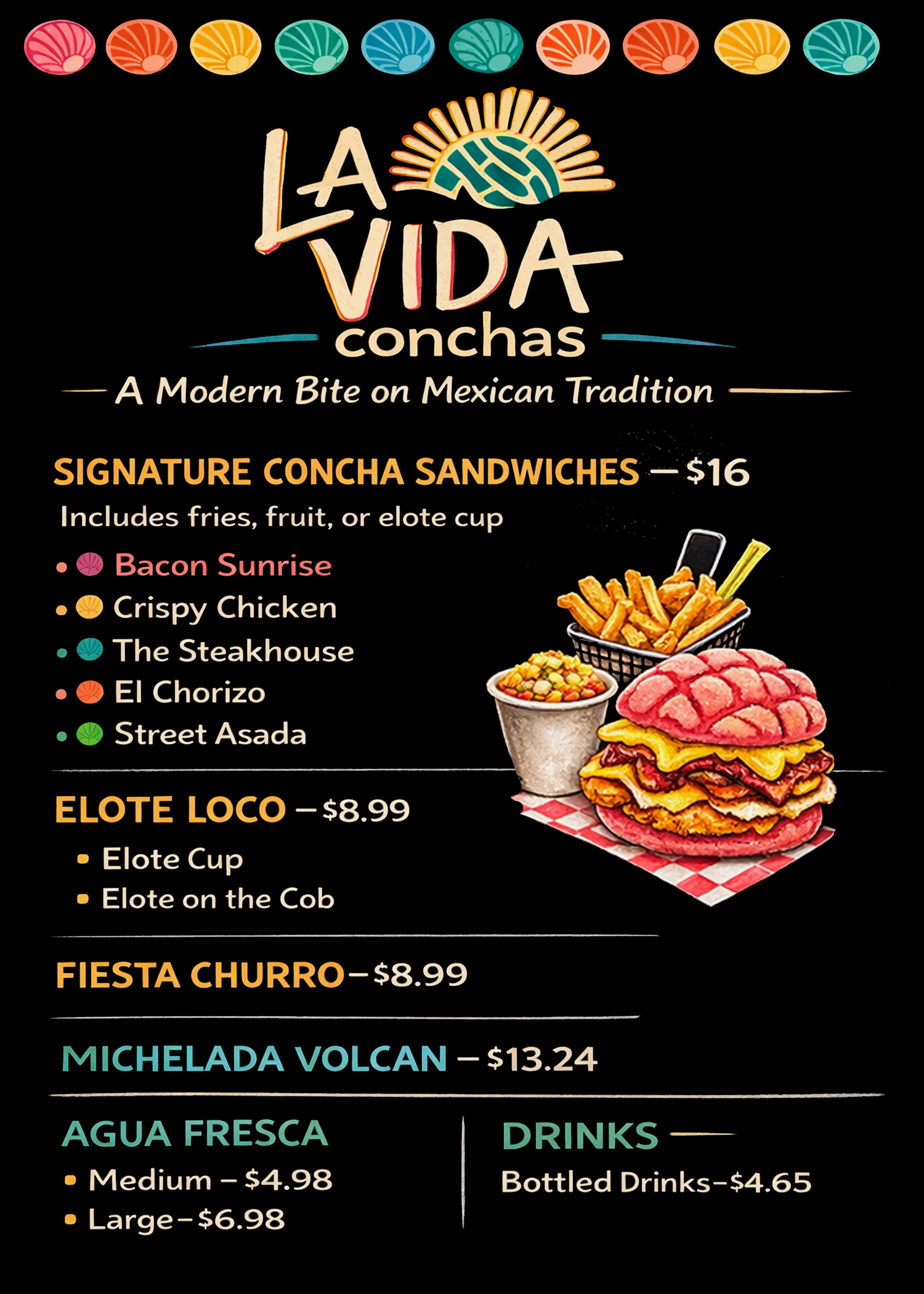 Enjoy a modern take on Mexican tradition with sweet and savory concha sandwiches. Located in Sawmills Mercado.